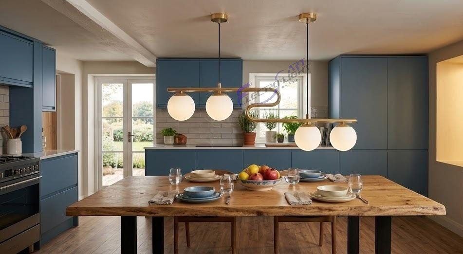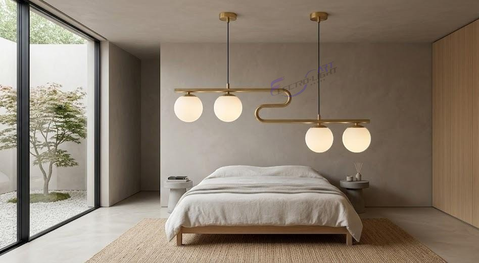Cele patru globuri din sticlă opalină sunt integrate armonios în design, oferind o lumină difuză, ideală pentru un ambient relaxant și confortabil. Distribuția liniară face ca această lustră să fie perfectă pentru iluminarea meselor sau a zonelor de socializare.