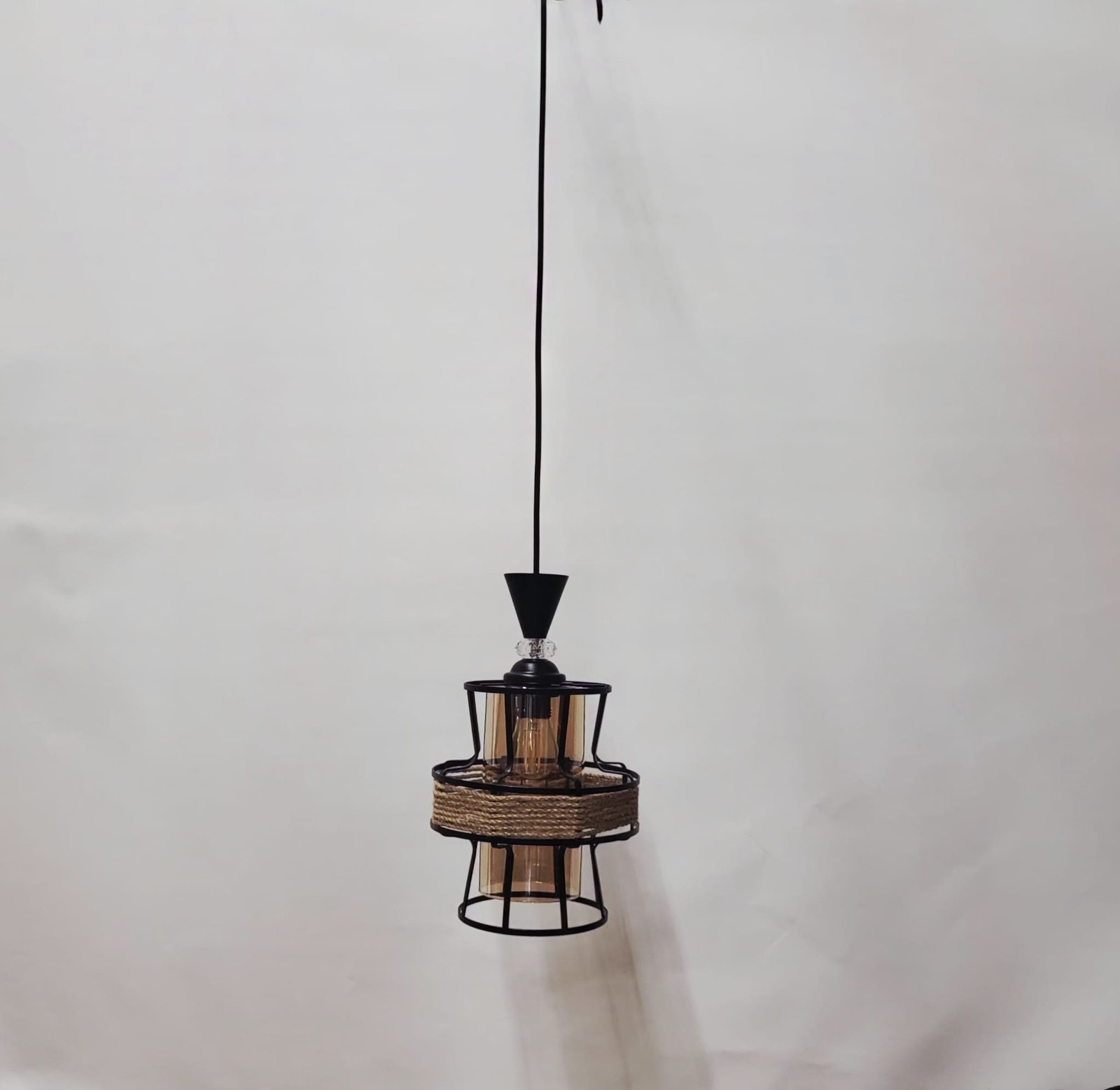 Pendulul 3049/1 îmbină farmecul rustic cu o notă subtilă de rafinament, devenind un element decorativ de efect pentru orice spațiu. Realizat din metal vopsit negru mat și sticlă aurie transparentă, oferă o lumină caldă, difuză și plăcută, ideală pentru interioare confortabile și elegante.