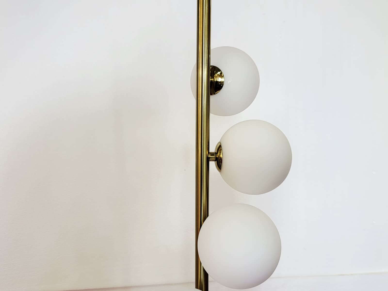 Lampadarul 5008/6 combină funcționalitatea cu un design contemporan minimalist. Structura sa din metal, cu finisaje negre și aurii, este evidențiată de șase globuri opace din sticlă albă, dispuse armonios pe tija centrală, pentru un efect vizual echilibrat și elegant.