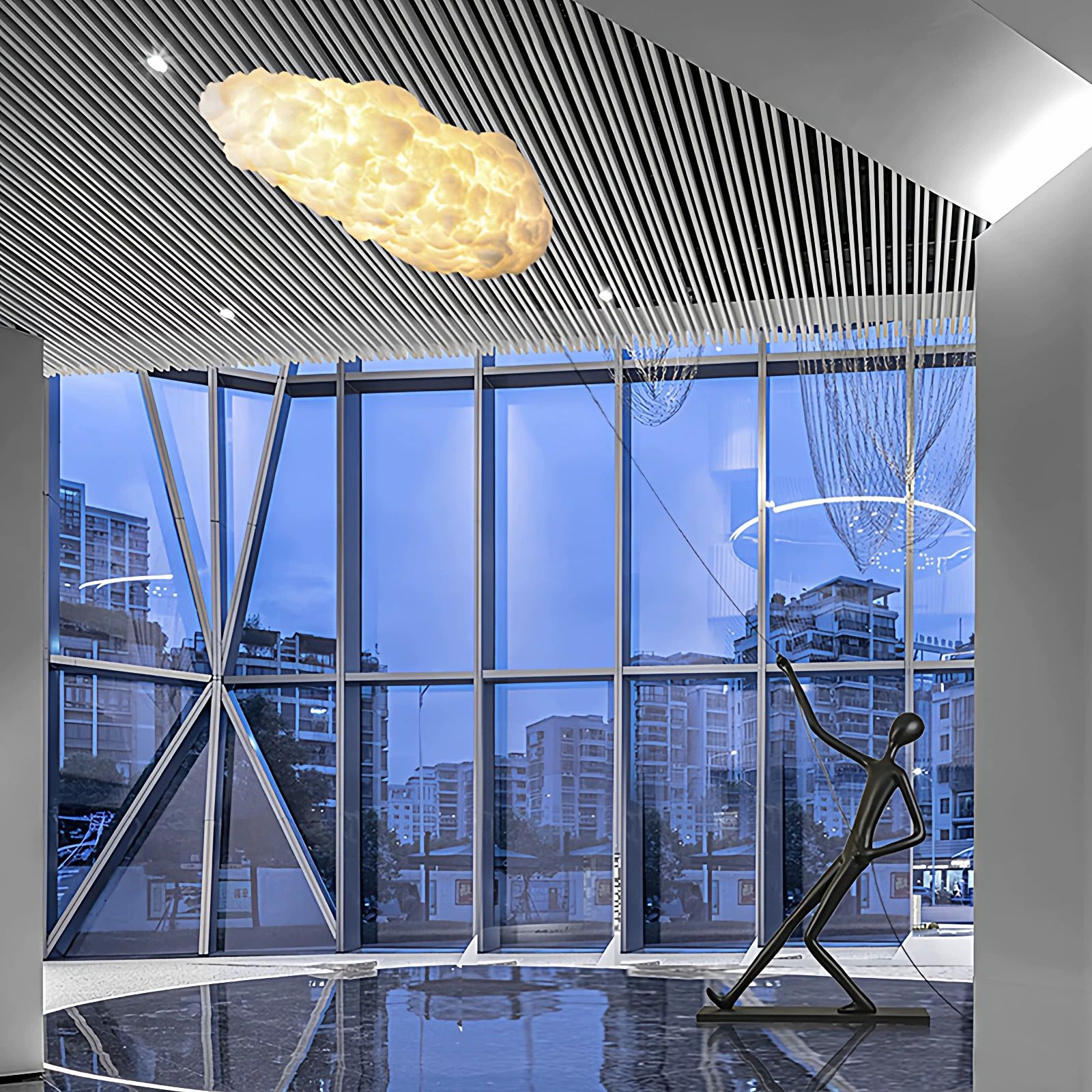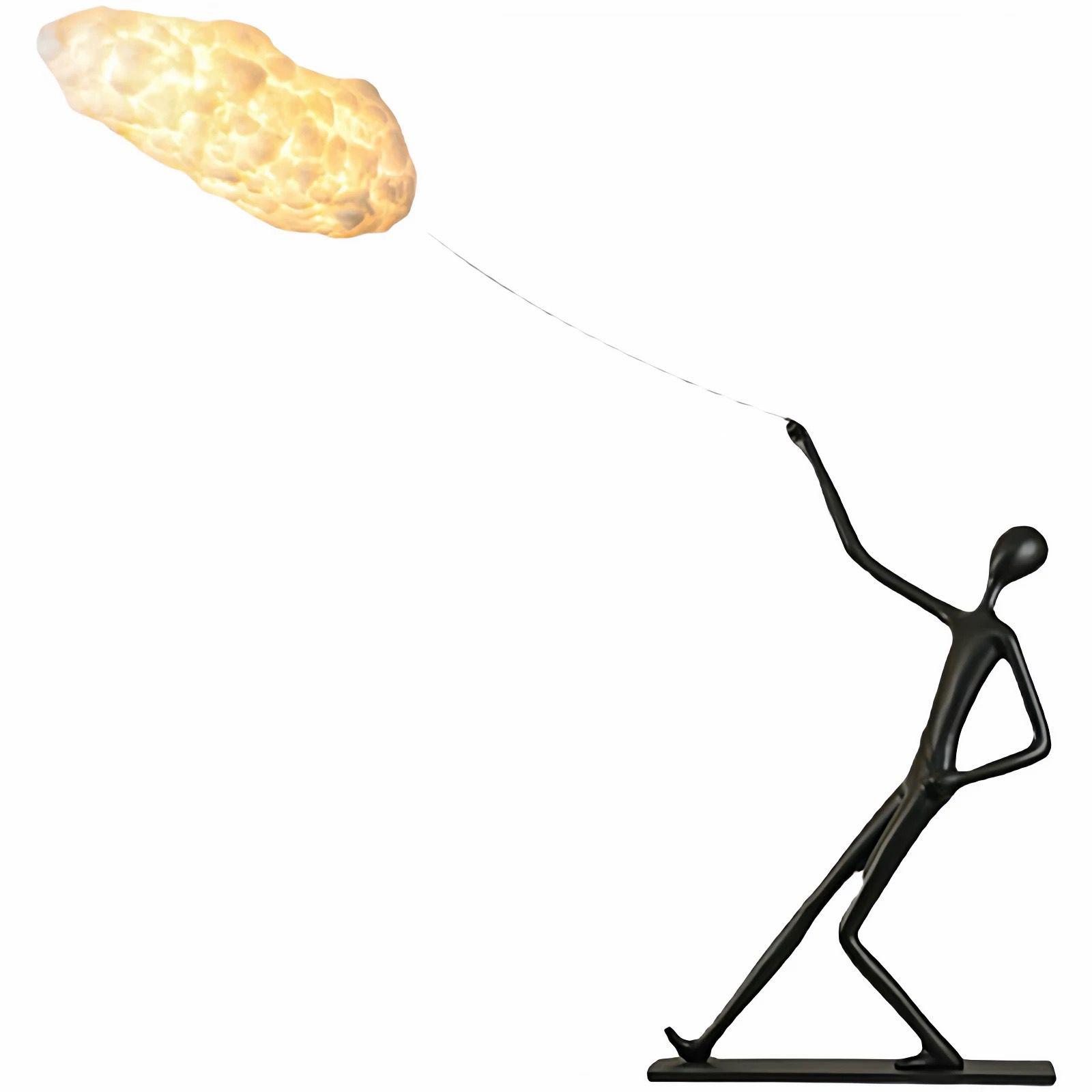Lampadarul model KY 9127-W este o piesă de iluminat modernă și artistică, concepută să aducă un accent vizual spectaculos în orice interior. Corpul prezintă o figură umană minimalistă, finisată în negru mat, care pare că trage un „nor” luminos – un design simbolic ce evocă imaginația, creativitatea și urmarea viselor.